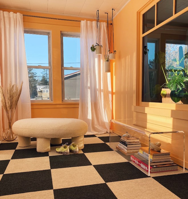 Harlequin, check, checkerboard, whatever you choose to call it… We can all agree that checkered floors have been everywhere lately. Whether it’s beautiful marble tile laid in the perfect harlequin pattern, a checkerboard handmade rug to spruce up a room in no time, peel and stick tiles to cover that drab old tile in your kitchen, or in my case, peel and stick carpet squares from Home Depot to add some interest to our sunroom on a very tiny budget.